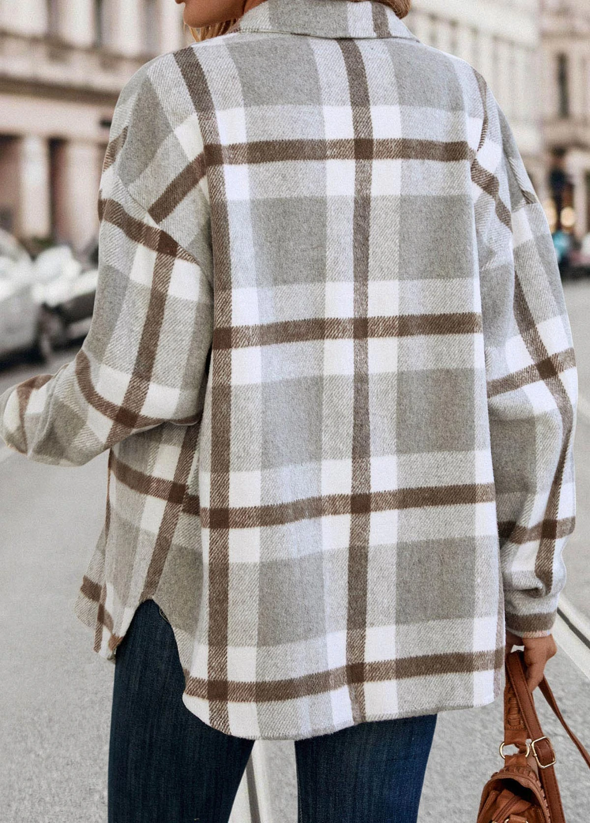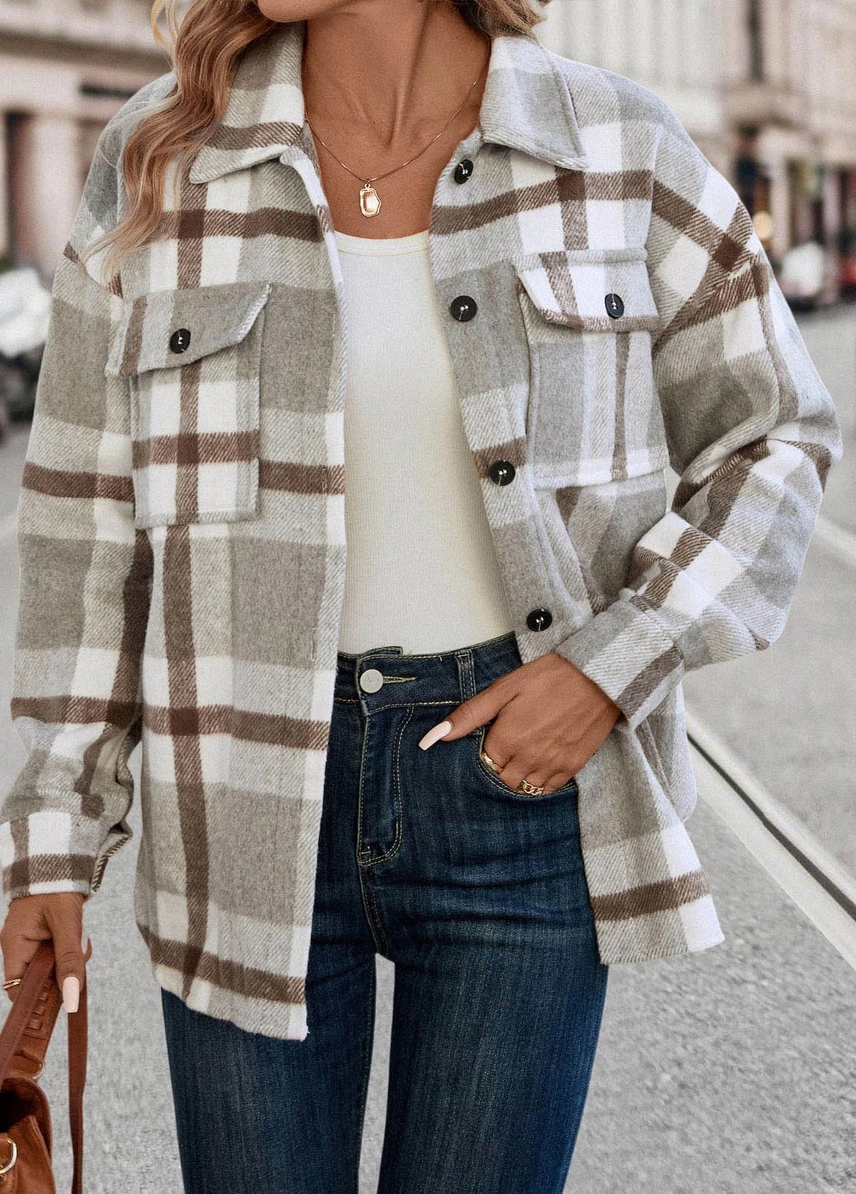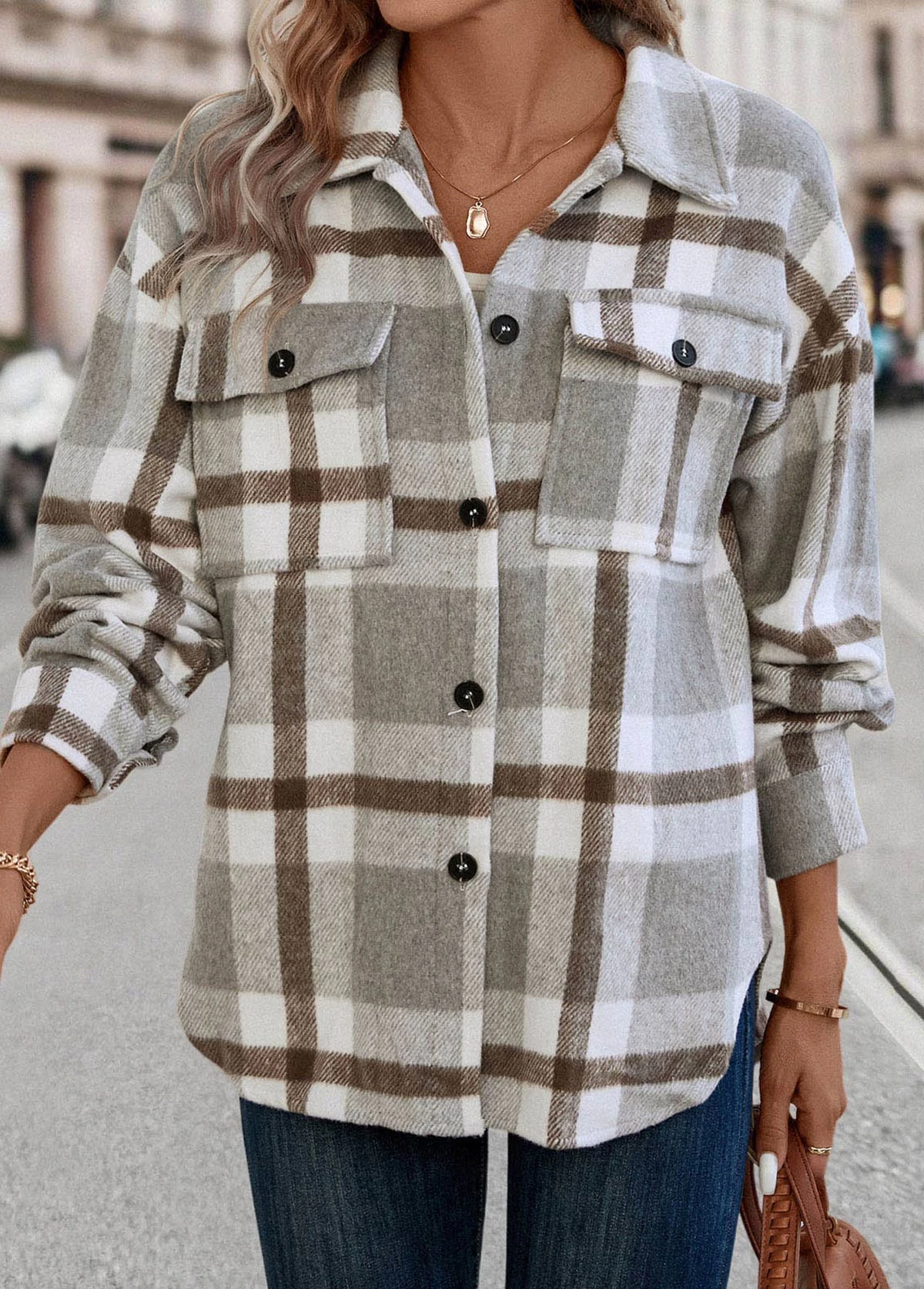 Be the first to review “Light Grey Pocket Plaid Long Sleeve Shirt Collar Coat” Cancel reply
