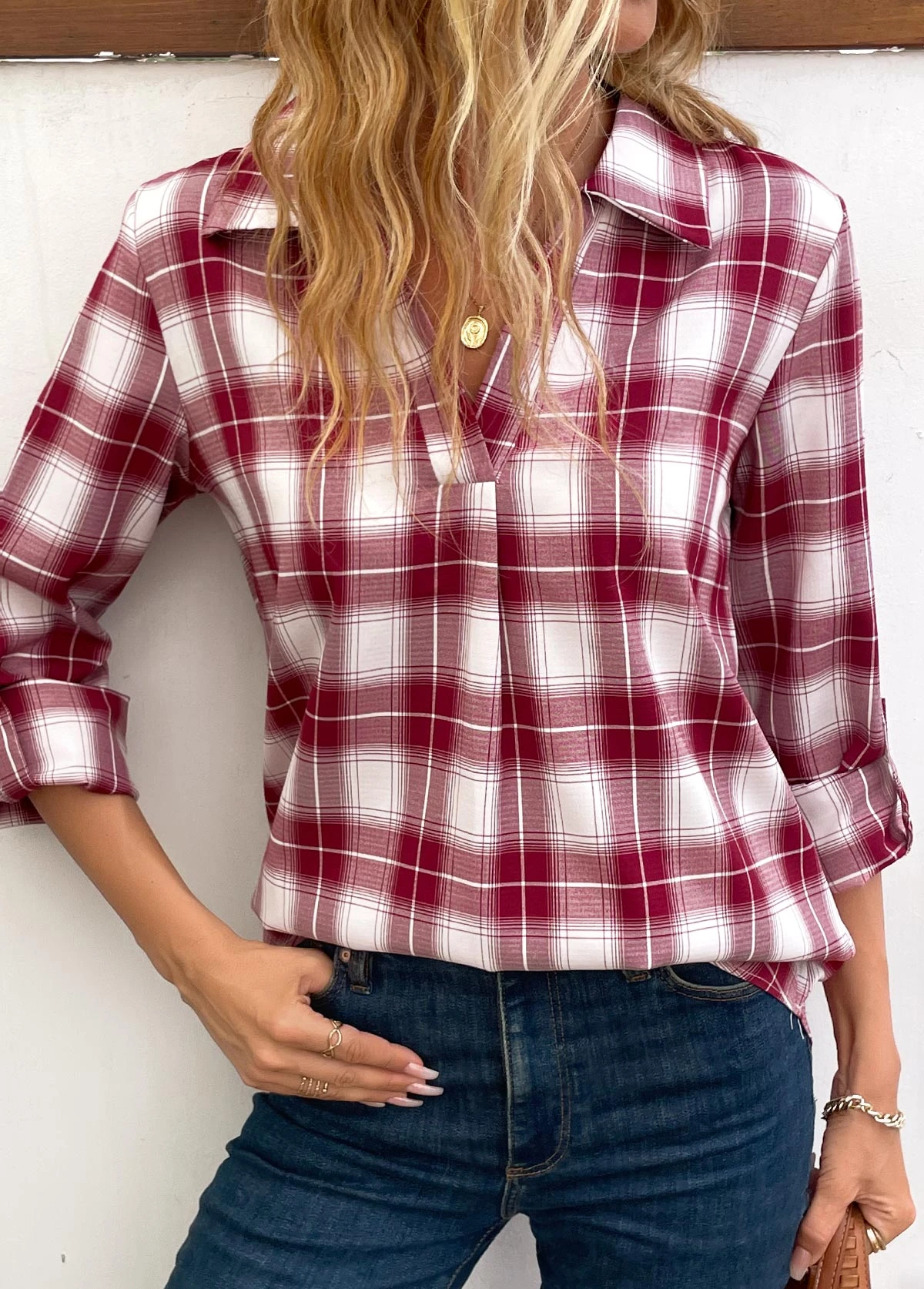 Be the first to review “Wine Red Split Plaid Long Sleeve Blouse” Cancel reply